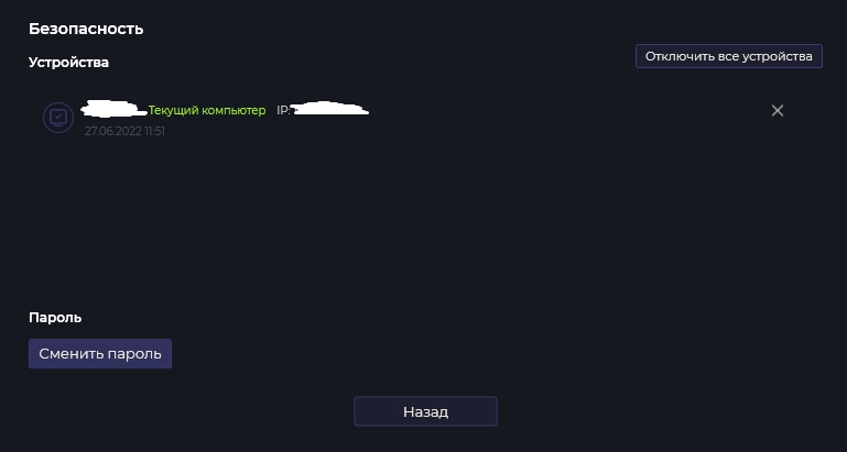 On the "Security" tab, you can see the current devices from which you logged into your account, the name of the PC and the IP address. You can also disable unnecessary PCs from accessing your account and change your password.