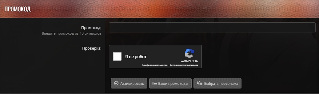 The site has a section with promotional codes, you can find a link to it in the game account or in the account settings. Occasionally we will post these codes with prizes in social networks. networks, on streams, and in general, wherever possible, so don't miss your chance! Instructions for activating the promotional code: Enter the received code in the "Promo code" field, collect the verification image and click the "Activate" button To view the list of your active promotional codes, click on the "Your promotional codes" button Happy prize hunting!