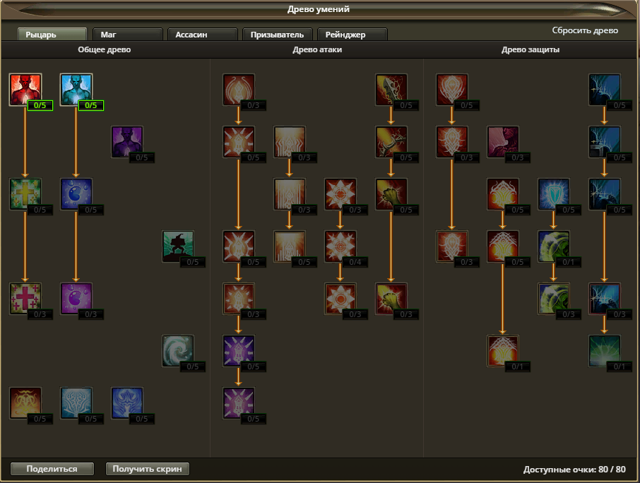 * 독특한 트리의 스킬을 배울 때, 예를 들어 레벨 55 스킬을 배우기 전에 레벨 50 스킬, 즉 이전 줄에 5포인트를 사용해야 한다는 점을 기억해야 합니다. 일부를 배우려면 책도 필요합니다. 액티브 스킬 (게임에서 스킬 위에 마우스를 올리면 자세한 정보가 표시됨)
