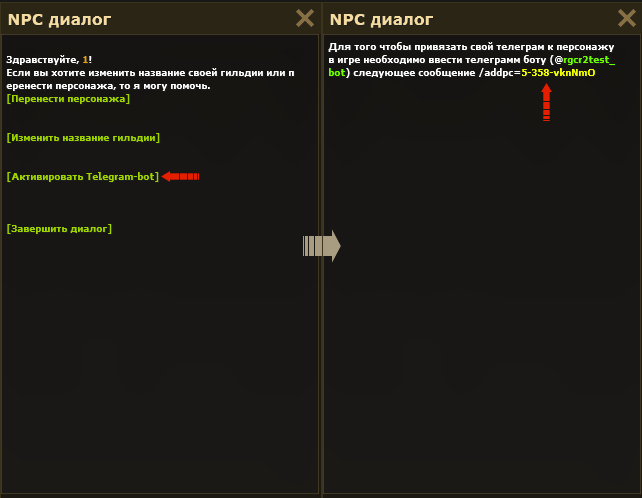 NPC와 대화를 열고 열리는 창에서 Telegram-bot 활성화 버튼을 클릭하십시오. NPC를 클릭하면 봇을 캐릭터에 바인딩하기 위해 캐릭터의 고유 코드로 명령을 내릴 것입니다.